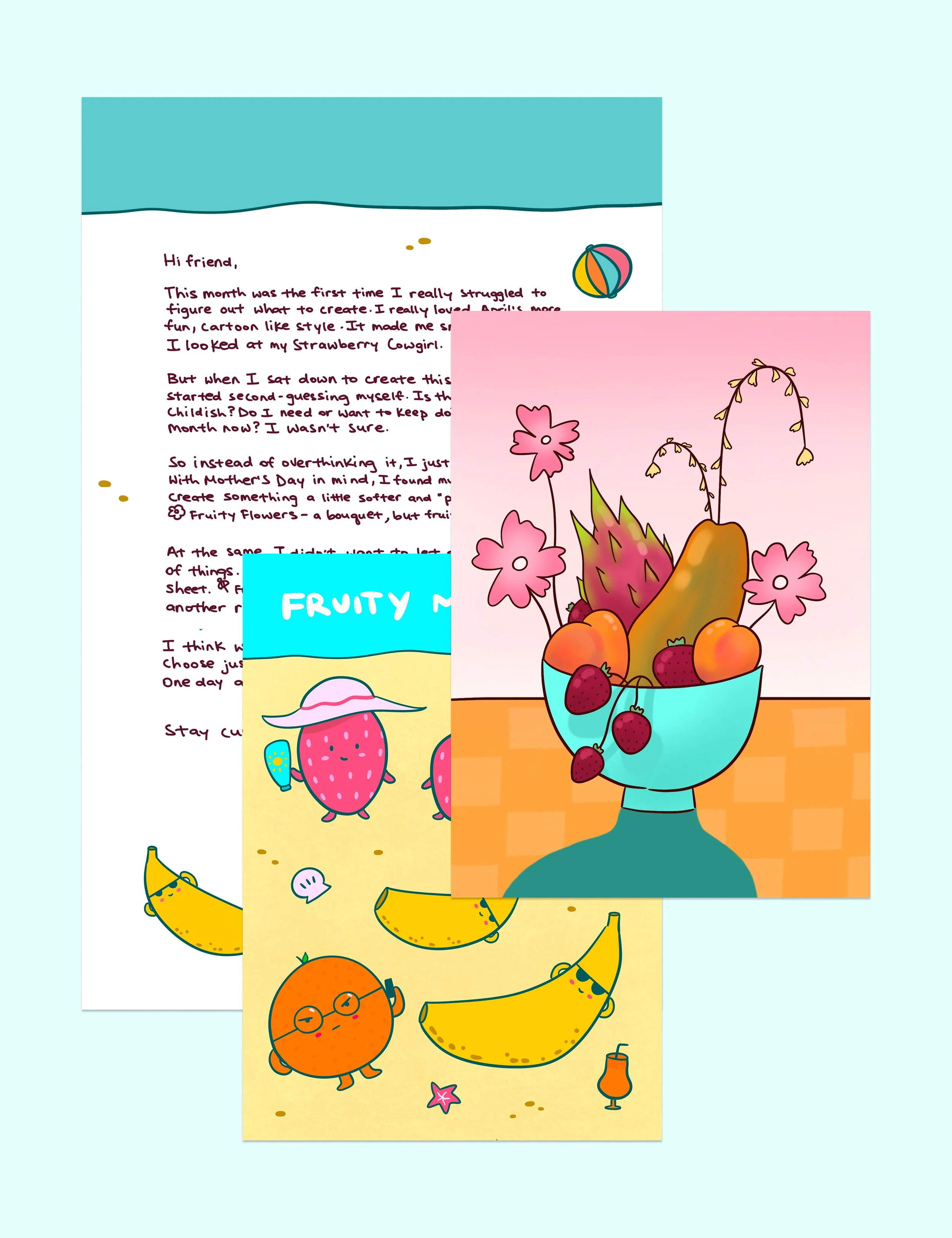 Hi, I’m Casey — a creative who loves to combine fruit, color, and curiosity by creating playful designs. I’ve always enjoyed sending and receiving physical mail and this was my way of sharing my artwork through that process.